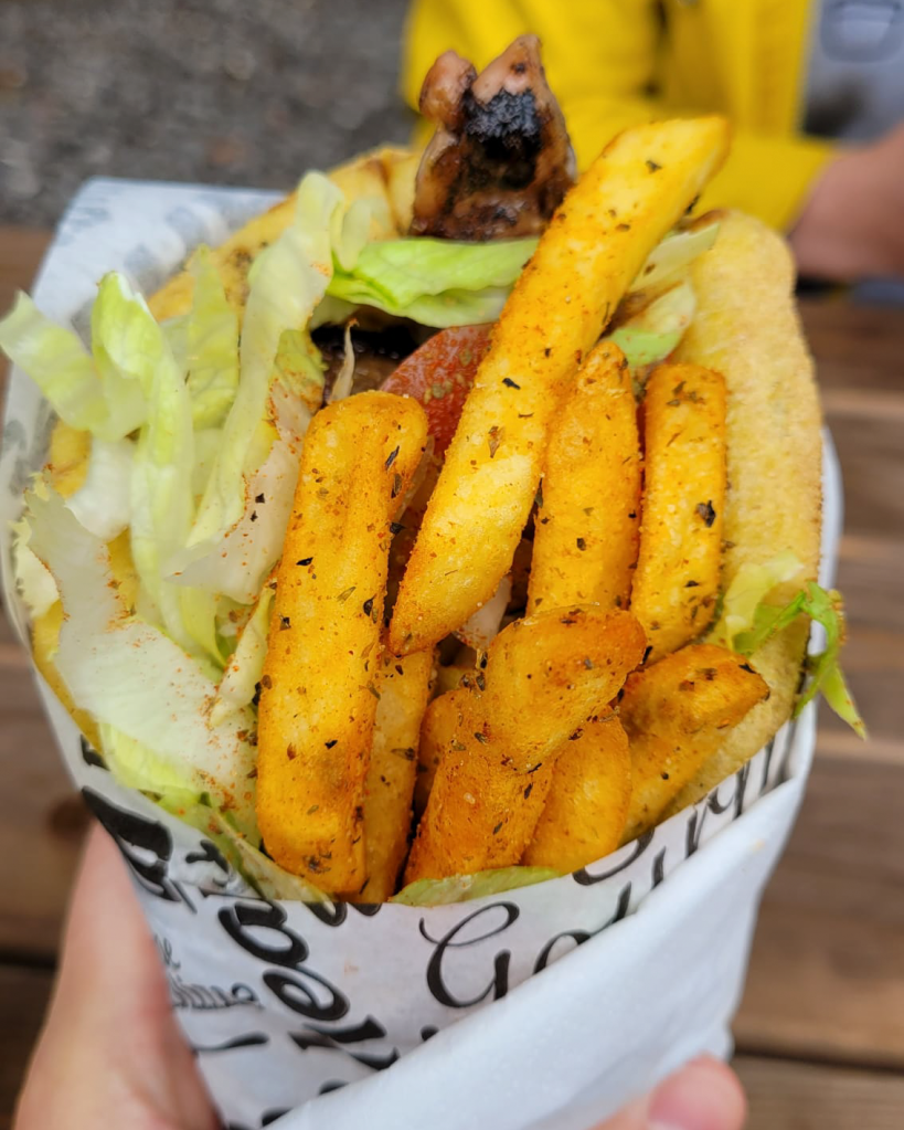 Laminated menu in hand, we took a seat at an outside bench, complete with view up to Rivington Pike. The garden is full of families, couples, cyclists and walkers enjoying some hazy pints, pizzas and burgers among the cosy, rustic ambience. The other food looks great and it’s clear that resident trader Dough N’ Co are proving popular with locals in the know – but we can’t resist the temptation of the gyros.