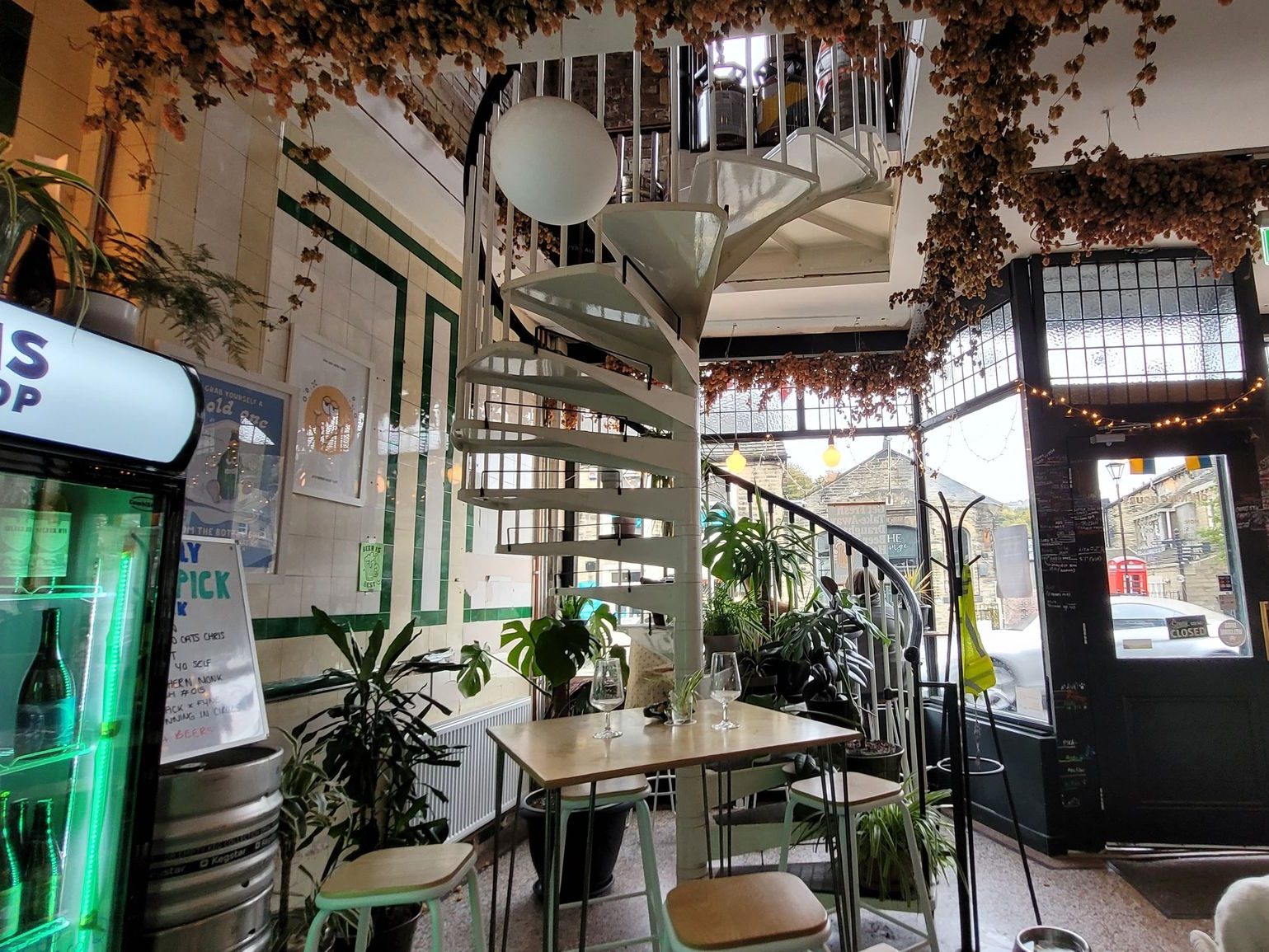 Heading through the door at O’Brien’s, you’re immediately struck by the old Mettrick Bros butcher shop features that lend it a unique ambience. While the bar area has been stripped back to brick, elsewhere, old white and green wall tiles have been retained. Luke explains that along with the terrazzo floor, these were rediscovered in ripping out the fittings of the Age UK shop that previously occupied the space. They’ve also made a feature of the spiral staircase that stands next to the door, covering it in houseplants to avoid any potential mishaps from wobbly customers.