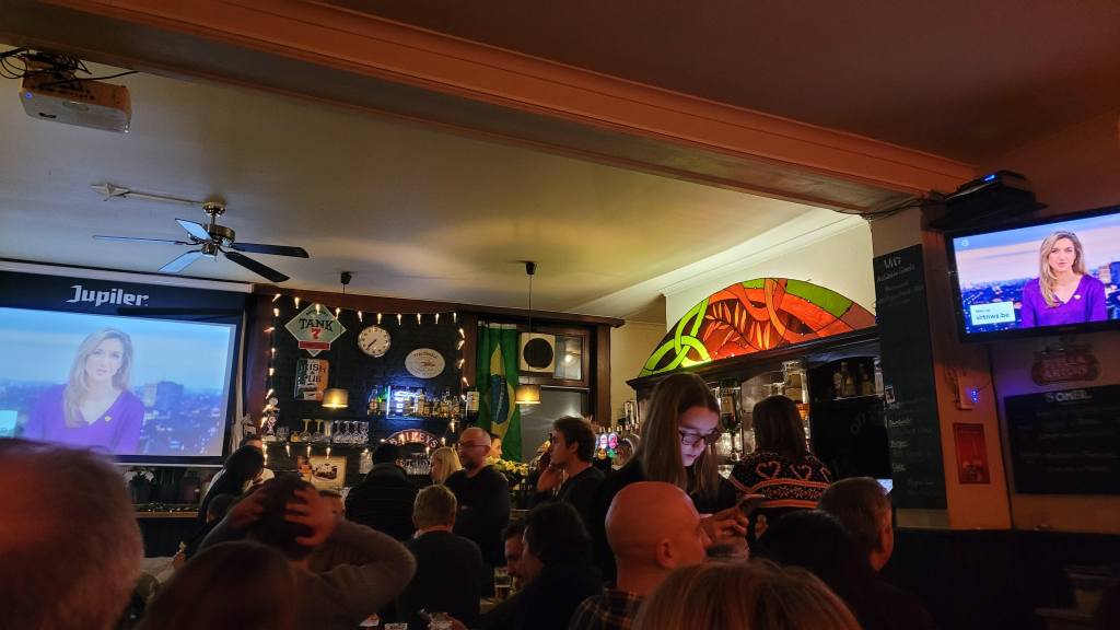 Owing to a tip-off from a fellow Frites customer in full 90s England shellsuit, we head for An Sibhin, an Irish bar around the corner. On arrival, we find the pub to be absolutely packed out with fans, but the bar’s owner sneaks us into a small bit of floor space with a tiny stool each. It’s an international affair in here, but almost everyone in the bar appears to be supporting England. To our left are a Belgian couple and to our right, two young women from Portugal and California respectively, all of whom are vocal in their dislike of the French team. One guy in an England shirt is confusingly half-Peruvian, half-Belgian and he tells me his club is Manchester United. Despite the result, our mood is buoyed by the a special atmosphere here, the cosy but buzzing ambience a world away from the rowdy stereotype the ‘Irish bar’ conjures up. Whilst Guinness is of course a popular option, for us it’s great to sip on some tasty Belgian brews during the game.