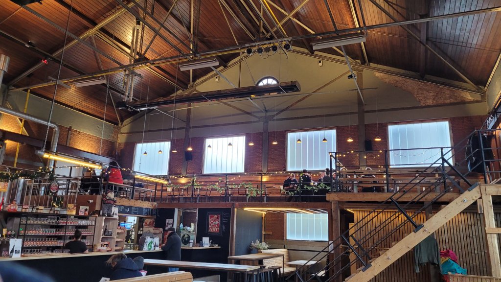 After taking a trip up to the top of the MAS for a view across the city and subsequently checking out the exhibitions on its other 9 floors, we’ve worked up a little thirst, so we head over to the Antwerpse Brouw Compagnie taproom. The company is best known for its Seef beer, not just a brand but the name for a style of pale ale brewed with buckwheat that originated in Antwerp in the Middle Ages. Seef pretty much disappeared from production twice in its history, once due to the occupation by the Spanish in the 16th Century and again when German forces arrived during WWI. ABC’s founder rediscovered the recipe in 2012 and made it his brewery’s flagship brew. It is possibly my favourite beery discovery of the weekend. The taproom is a big open industrial space, which has been made cosy and Christmassy at this time of year by the addition of a big tree adorned with red baubles.