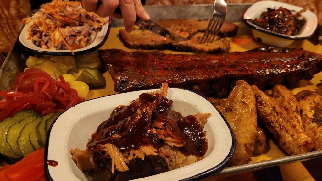 From here, we take the short walk over to the onsite restaurant Black Smoke, acclaimed for its Belgian take on American BBQ. On entry to the imposing industrial space, we head up to the restaurant floor (there’s also a bar and a roof terrace for drinks), where we must first make our way through a neon-lit room covered in white butcher’s tiles, and push through a plastic curtain to enter the main dining room. Here we are greeted, not only by the host, but a heady mix of intoxicatingly smoky aromas. The smell alone sets expectations sky-high as we sit down to eat. We order the BBQ sharing platter for two as it seems foolish to limit our choice, but before this comes we are greeted with complementary bread served with smoked beef fat as a deliciously indulgent spread. Eating so much of this is instantly regretted as the main event arrives on a huge tray. The meats we’re presented with are all dreamily succulent, from the rack of pork ribs to the butter-textured brisket. For me though, the highlights are the pulled beef with its note of maple sweetness and the chicken wings where the flesh falls off the bone, demanding to be dipped into one of the house-made table sauces. The sides are worth a mention here too, both the smoked baby potatoes served with a smoked aioli (yep, there’s a theme here) and the wide array of pickles and slaw.