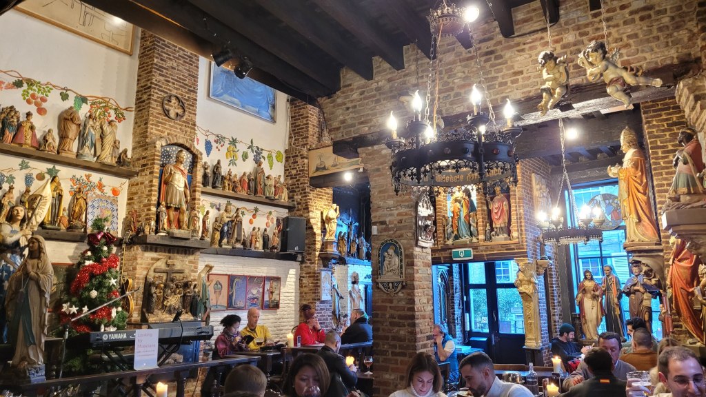 Our afternoon is spent largely exploring the Christmas markets across the Grote Market in the Old Town and by the riverside, taking in the Antwerp Story exhibition along the way. The foody highlight is a gloriously unctuous hot chocolate made from 70% cocoa chocolate stirred into hot milk. We also make a stop-off at the super-kitsch Elfde Gebod bar opposite the cathedral, where religious statues and trinkets cover almost every inch of space along its walls. Sat on our throne-like seats, saints and angels look on as we sip on our drinks.