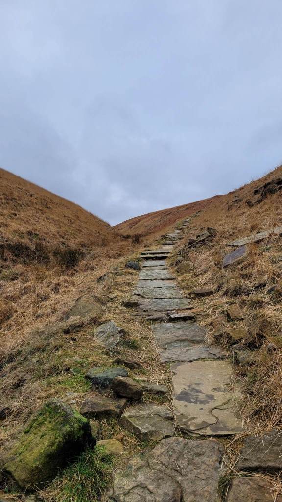 We start out along the canal path towards Standedge Tunnel. On approach, we learn from signage that this is the longest canal tunnel in the UK, running under Standedge Moor for 5km. Once we reach the visitor centre, we join Waters Road until we eventually find the footpath which leads up to the moor via Eastergate Bridge. Here, a few other walkers are picnicking. With the usual polite greetings uttered, we are then over the bridge and take the long straight packhorse route up and over the hilltop. The flagstone path offers dramatic open views of the moor on this bracing, grey February afternoon.