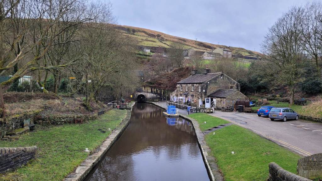 We then turn around to head back towards Marsden, across the moorland again but along the opposite side of the Haigh Clough ravine. Eventually we rejoin Waters Road and get ourselves back onto the canal path. After around 2 hours, our step is quickened by the prospect of beer and food.