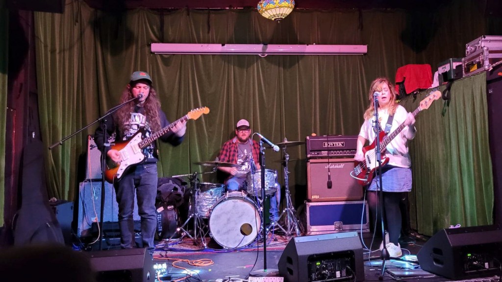 In support tonight is Big Loss from Northampton. Well, sort of from Northampton, they admit they very rarely get to practise together as guitarist/singer Joel Harries now lives here in Manchester. You wouldn’t think it, given the impressively tight set of modern emo they deliver. Especially notable are the harmonies displayed by Harries and fellow singer/bassist Jo Collis as well as his deftly intricate fretwork. There’s a subtle angst to tracks like ‘Three Knots Unravelling’ which belies the twinkly chorus-washed guitar they favour and I would certainly seek them out again.